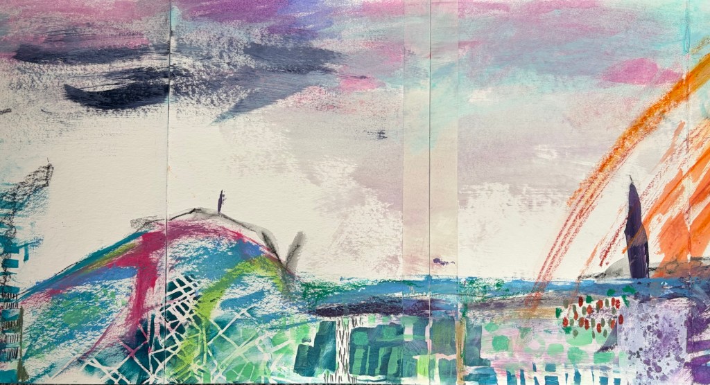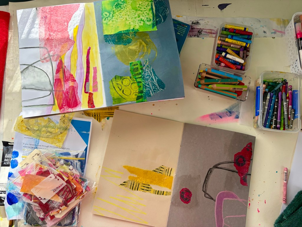 That pressure manifests in my art practice. I’ve been making small abstract landscapes using collage and mixed media, and love the process. I’ve got 5 days at home to do my own thing over Easter. Am I creating new works? No … instead, I feel compelled to finish anything that’s lying around, from paintings to art journals. Sometimes, while I wait for multiple pages to dry, I clean out a draw or cupboard.