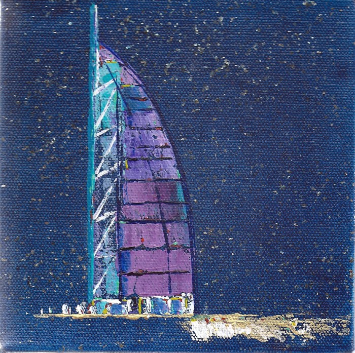 As many of you know, I sold approx 60 art shares for our trip to Italy for the Legato exhibition, and each share holder was to get a 6×6″ painting inspired by the trip. 59 down and 1 to go heading into the festive season. I left this one painting till last because I agreed to do something different for one couple. I probably shouldn’t have agreed, but I did, for reasons I think I have some small understanding of. Everyone else got a poppy painting, but this couple wanted something about Dubai; the Burj al Arab to be precise. I won’t go into why they wanted Dubai instead – that’s their story to tell, not mine.