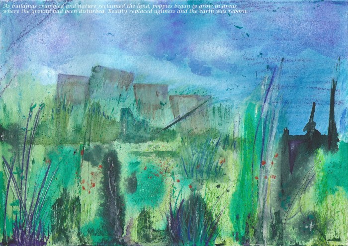 I have done a lot of works inspired by the old Patea Freezing Works over the last few years, and since going to Italy in 2010 I’ve also done a lot of works that involve poppies. Last night I combined the two and depicted the freezing works site regenerating, with poppies growing where the land has been disturbed, just like in Cassino, Italy. I kept one derelict building at the far right, and a few ‘ghost’ buildings along the horizon, where they still exist in my memory. I used Golden airbrush acrylics, a super fine Sharpie pen, Faber Castell aquarelle sticks and Caran D’Ache Neocolors, then added text in Photoshop.
