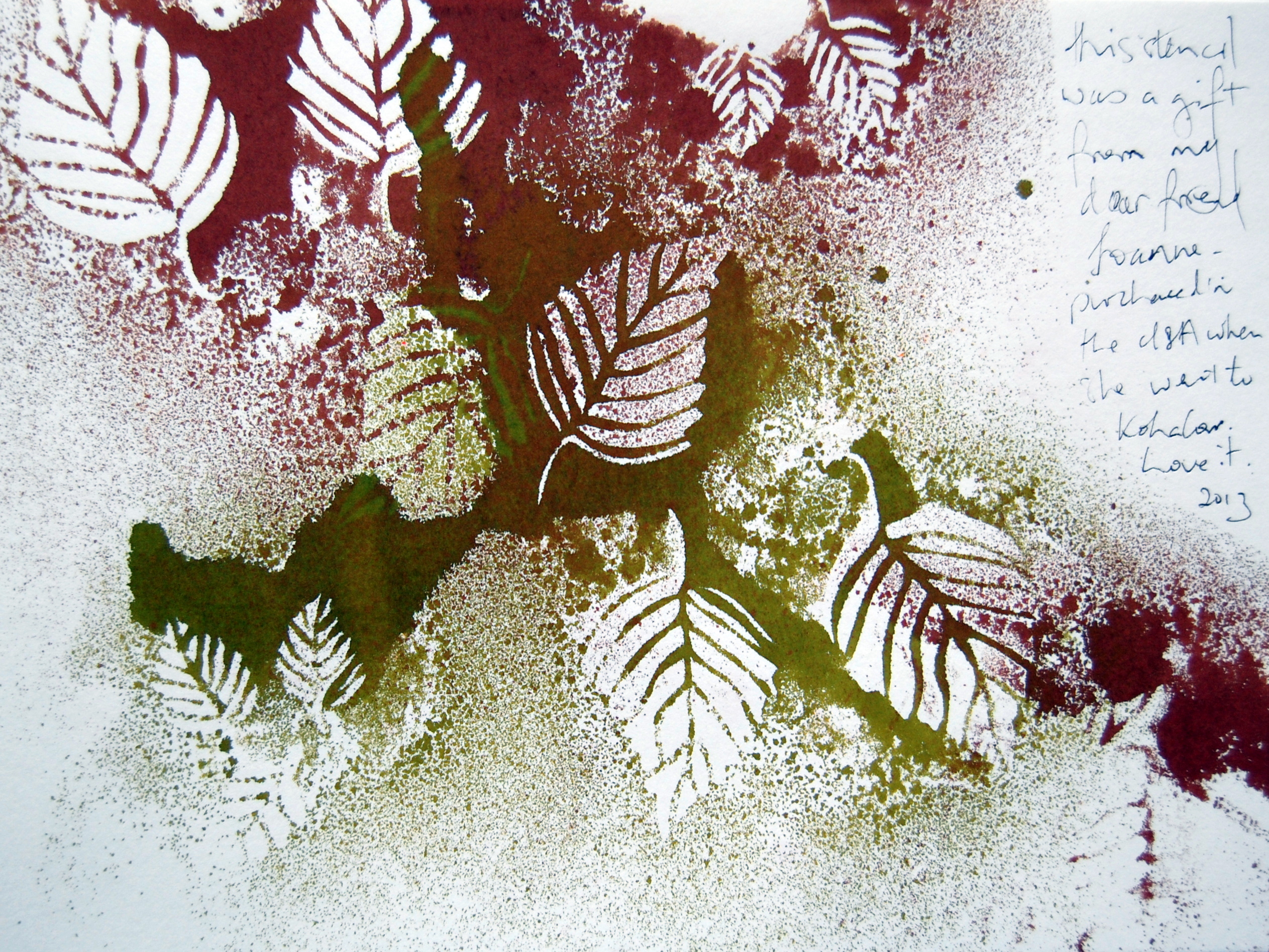 My dear friend Joanne Dillon bought me back some stencils when she went to the USA recently. One of them I had seen someone using on an art video on YouTube and had been lusting after it – and now it’s in my stash. How awesome is that? Today I got out my art journal, new stencils, inks etc and had a play to get a feel for them. Most of these pages aren’t finished yet but I wanted to share progress shots. JD – you rock!