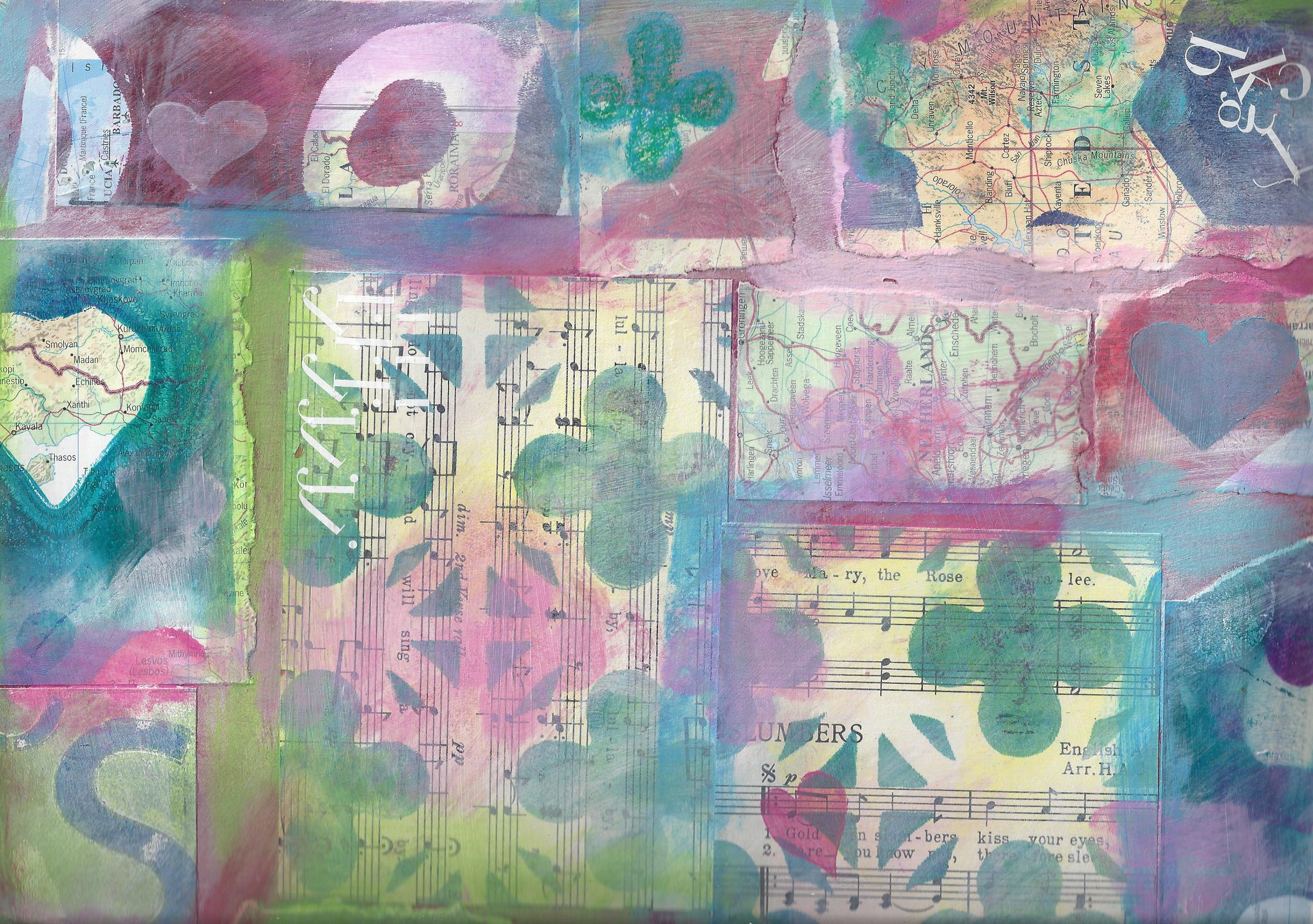 I have a small pile of 12×12 scrapbooking cardstock in colours I don’t use anymore so I’m slowly using it up as the base for works where the initial colour won’t show. This one has layers of gelli print scraps, stencils, old rub-on letters, patches of colour with Gelatos etc. All good so far, but what next? I’ll leave it on my desk for a few days and see what happens. (only part of the 12×12 is shown)