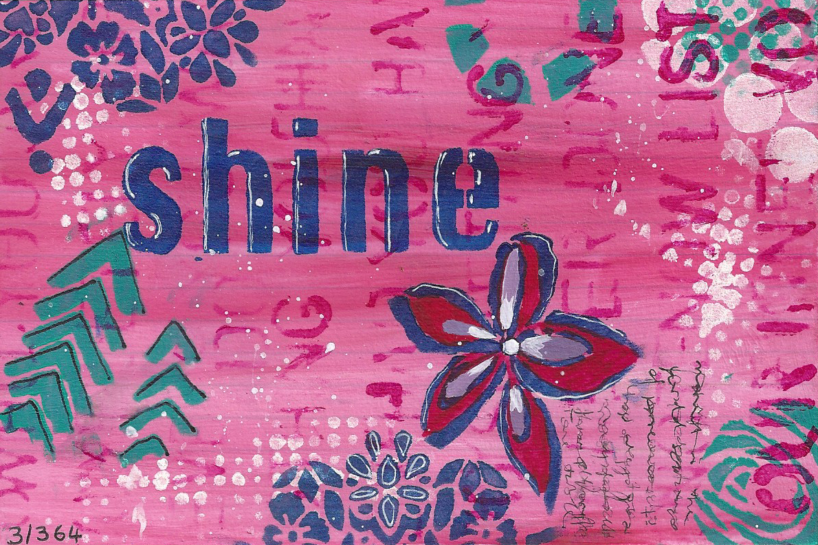 Acrylic paint, pencil, Sakura gel pen, Stencil Girl stencils, Tom Holtz stencil, fine black pen. Once again I have scribbled down my thoughts, and SHINE reflects the lovely sunny day I have enjoyed.