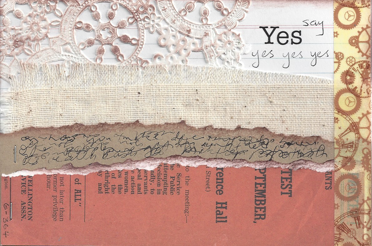 Linen scrap, paper scraps, old postcard. Tim Holtz tiny attacher, paper doily, fine black pen, washi tape, Memento chalk ink, Rub-ons,