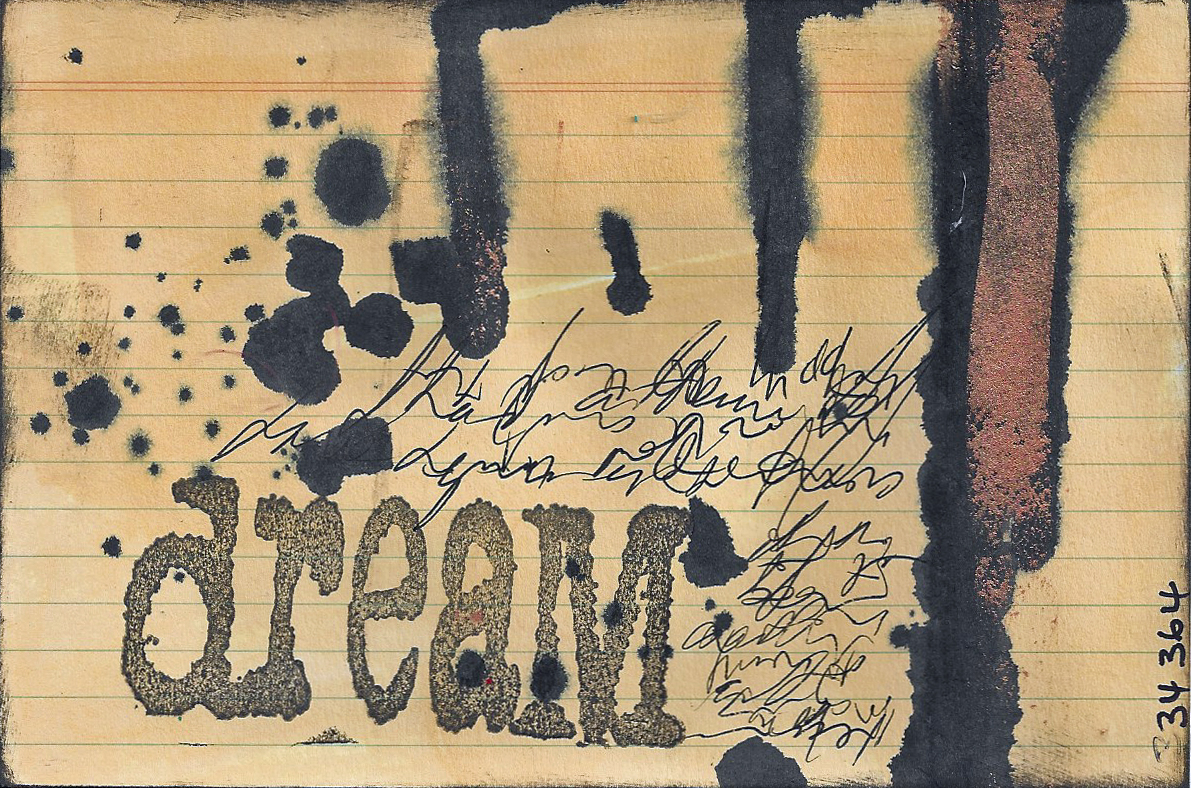 Acrylic paint, Golden metallic fluid acrylic, Stazon ink, rubber stamp, fine black pen.