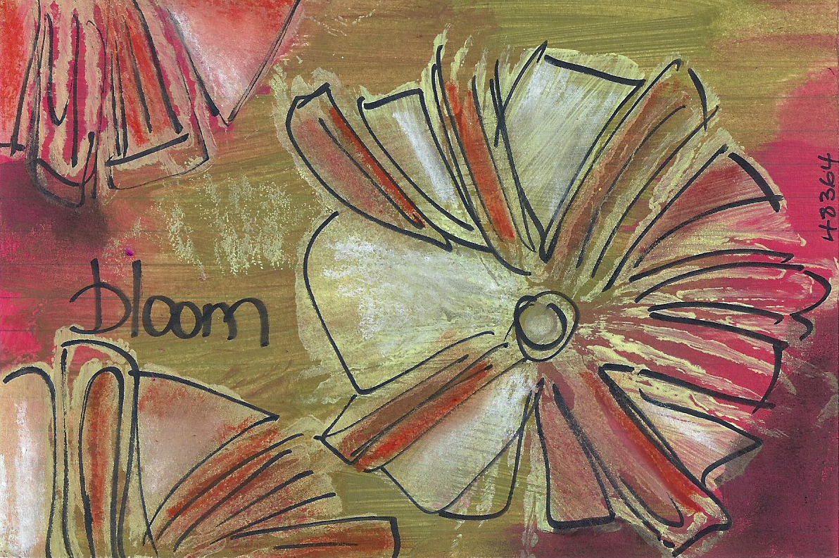 Stencil Girl stencil, gesso, Tim Holtz distress paints, water soluble oil pastels, pencil, calligraphy pen, fine black pen.