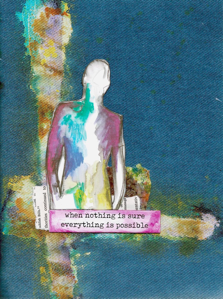 This is the Dina Wakley blue journal, acrylics & gloss sprays and Tim Holtz idea-ology quote chips. The chips are thick, great for assemblage, but I peel most of the back off so they sit flatter in my journal.