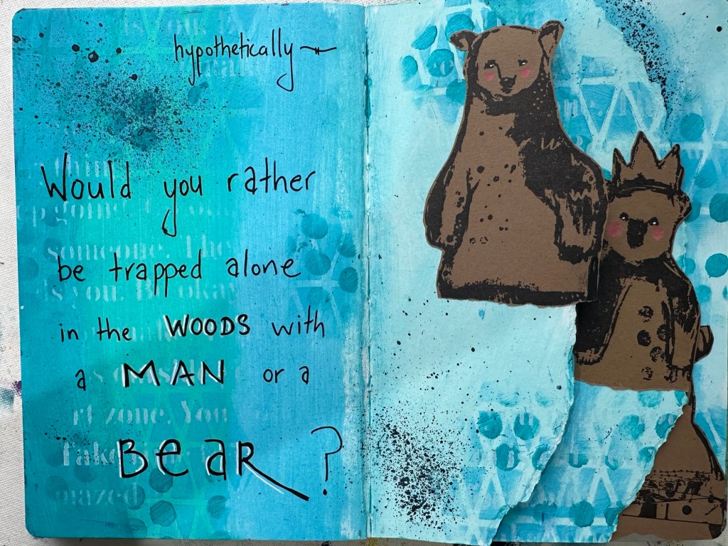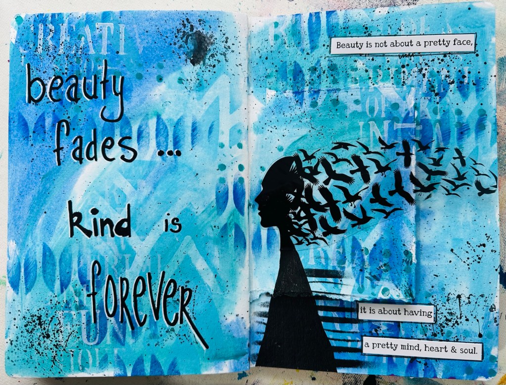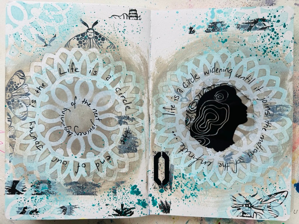 I love the latest Dina Wakley journals. The paper is thick watercolour paper, it’s a nice size to work in and they hold up well to cutting or tearing. With this journal I decided every layout would have something different: maybe a shaped edged, a cut out, or waterfall edges.