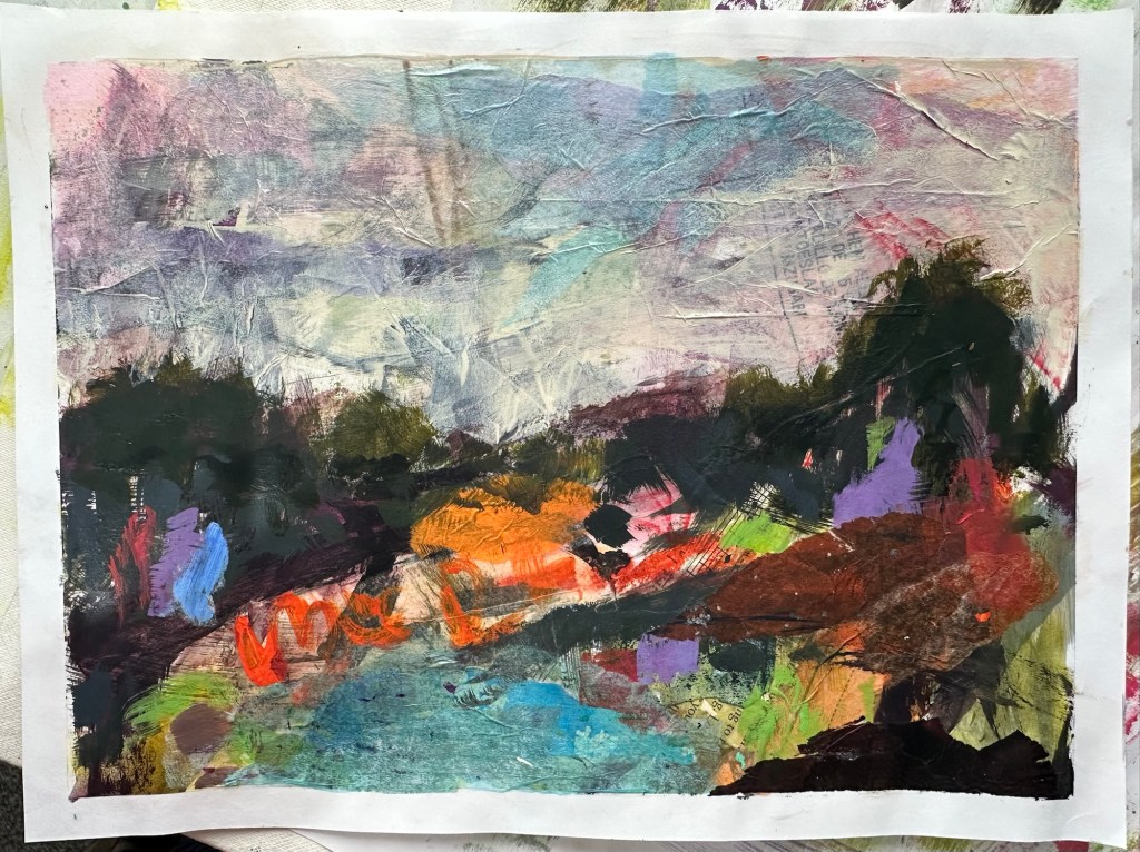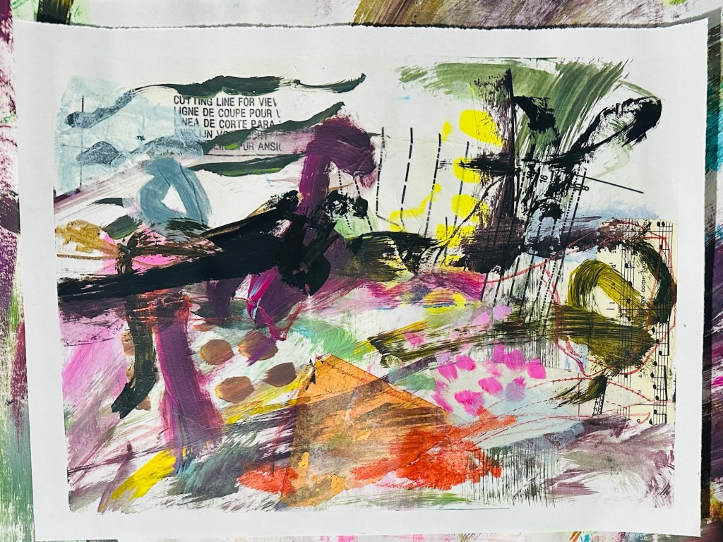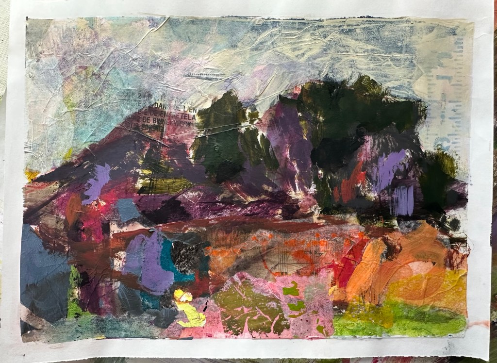 I’ve done the first few layers and am finding scaling up tricky. I keep using tiny bits of collage, which worked well on the original small paintings, but look fussy at this scale. I know the key is to just keep going, but I’m also going to make a deliberate effort to work bigger.