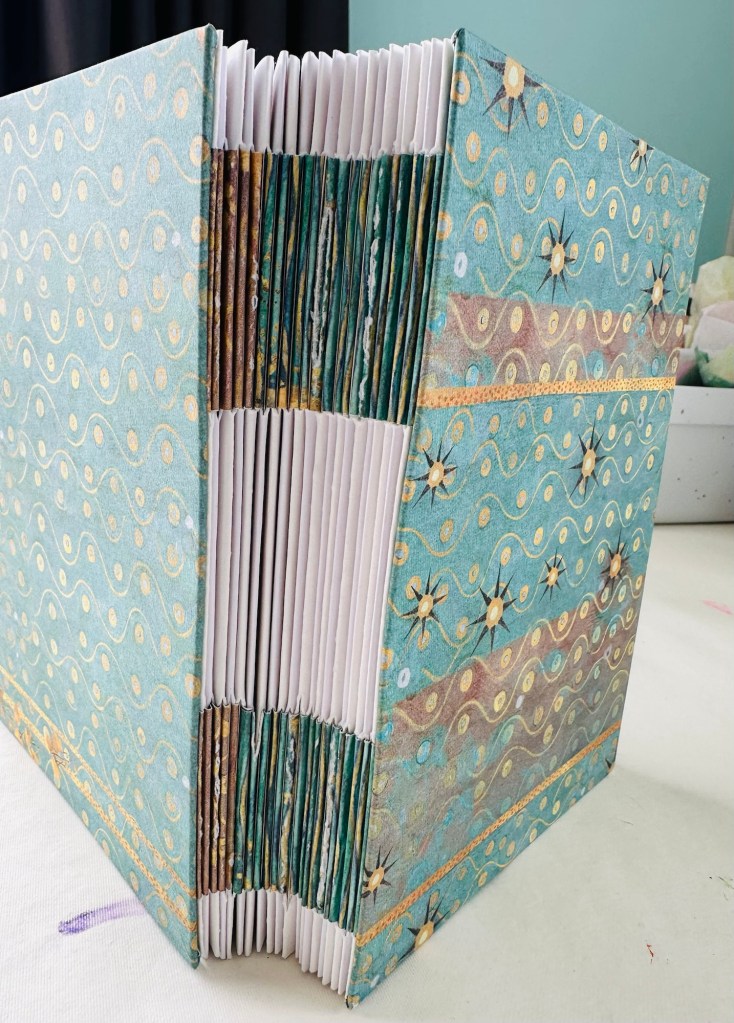 There’s a pre course class where you make a book to use for the course if you want … of course you can use what you already have, or buy one. I can do a simple sewn signature journal, but not much else. This looked achievable so I have it a go.