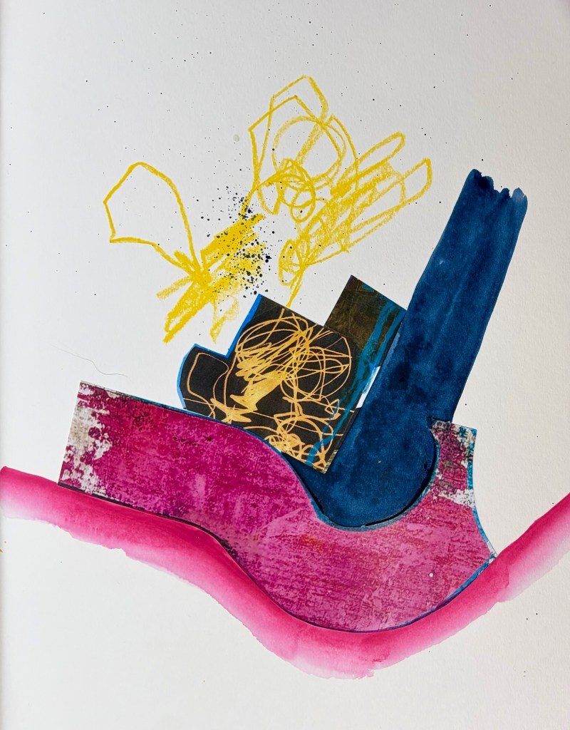 In the video Jane made 8 collages to work back into. I sat down and filled 3 sketchbooks, or 60 layouts, with the two-piece collages to work back in to.