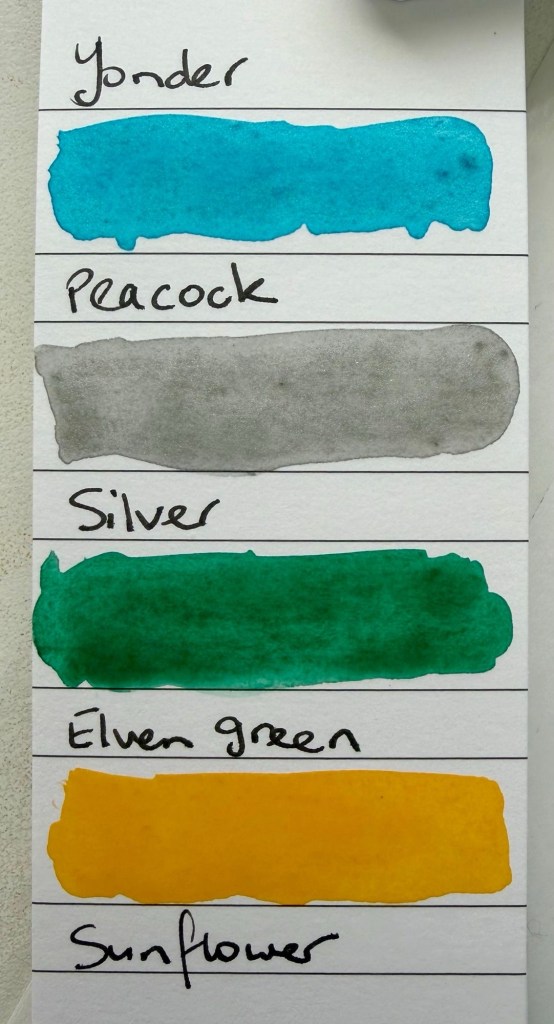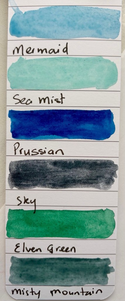 I recently purchased the ‘Under the sea’ set of paints from Yonder Paints, a small artisanal business in Otepoti Dunedin, here in New Zealand. The set came in its own wee tin and the half pans have a wee magnet on the base to hold them in place. They make their own binder, which includes clove oil as a preservative, and they’re all hand-milled in small batches. My parcel included a hand written note, watercolour swatch cards and a couple of sample dots. Just lovely!