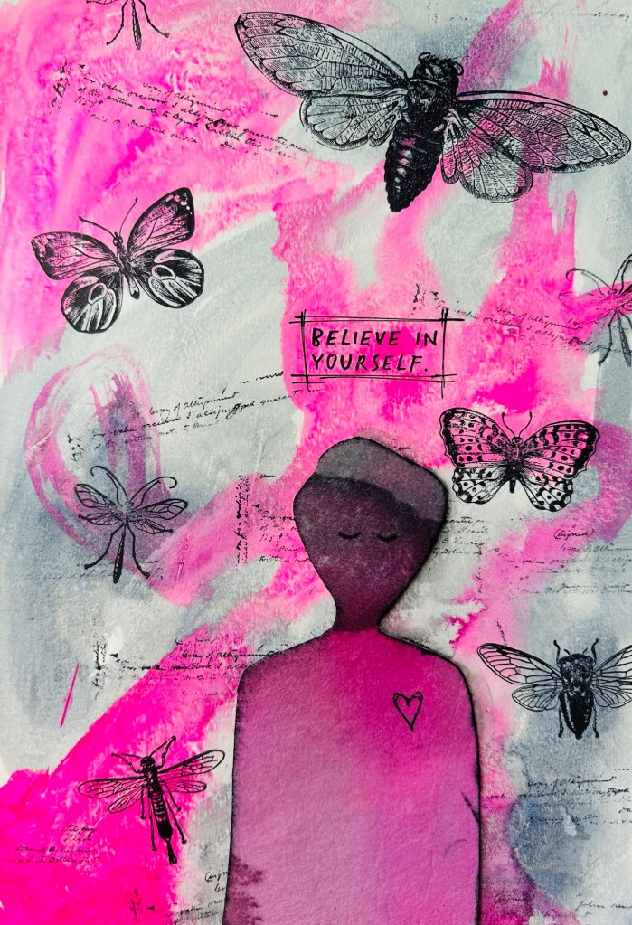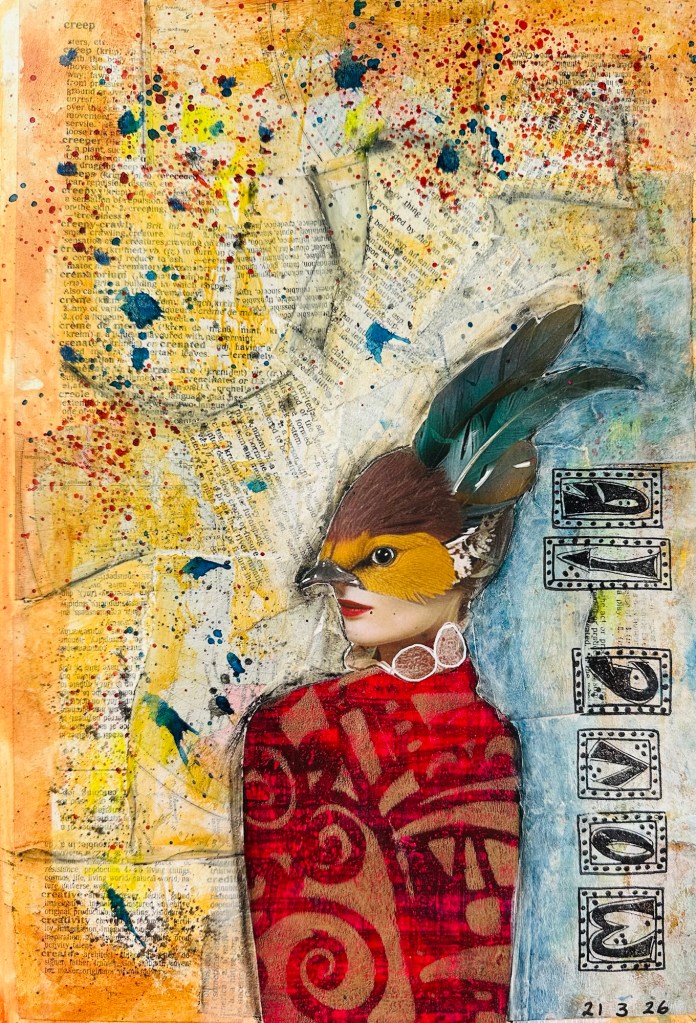 I’ve used paint, ink, collage, NeoColour II and pencil. It’s dying overnight and I’ll keep working on it tomorrow after work.