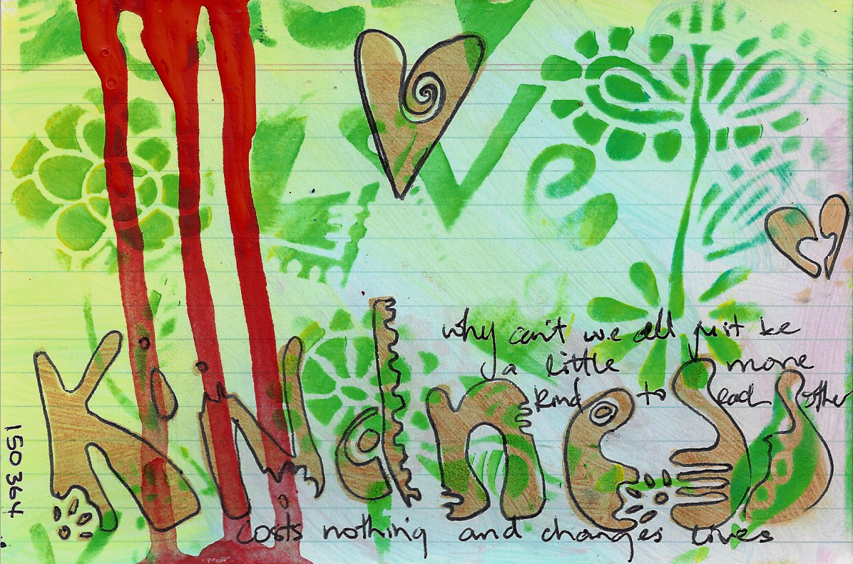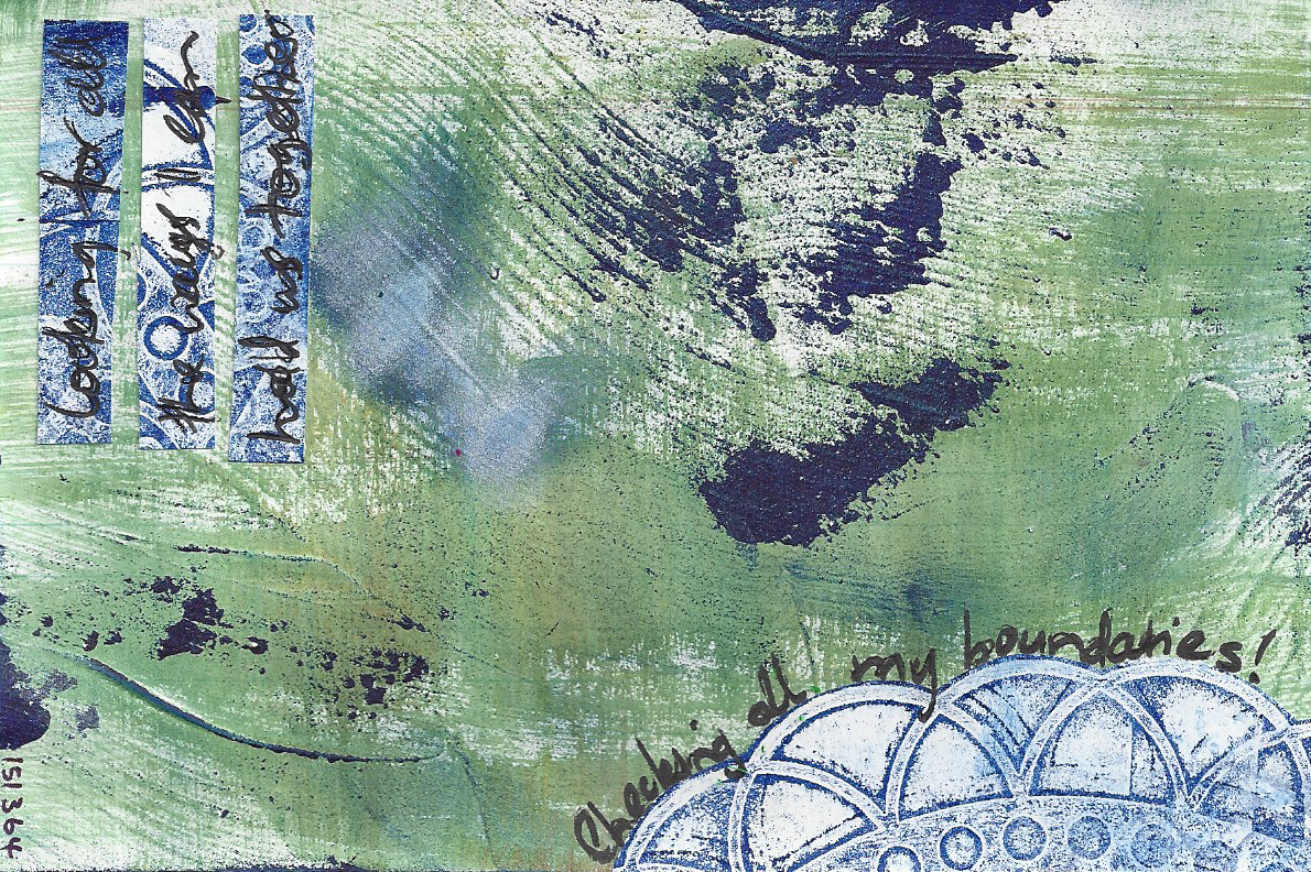 Stencils, acrylic paints, Derwent Artbars, hand made HIM stencil, Gelli print scraps, scrapbooking paper, calligraphy pen, silver pen, paper masks, brayer, rub on lettering. And, yes, I did accidentally stamp HIM with the card the wrong way up!
