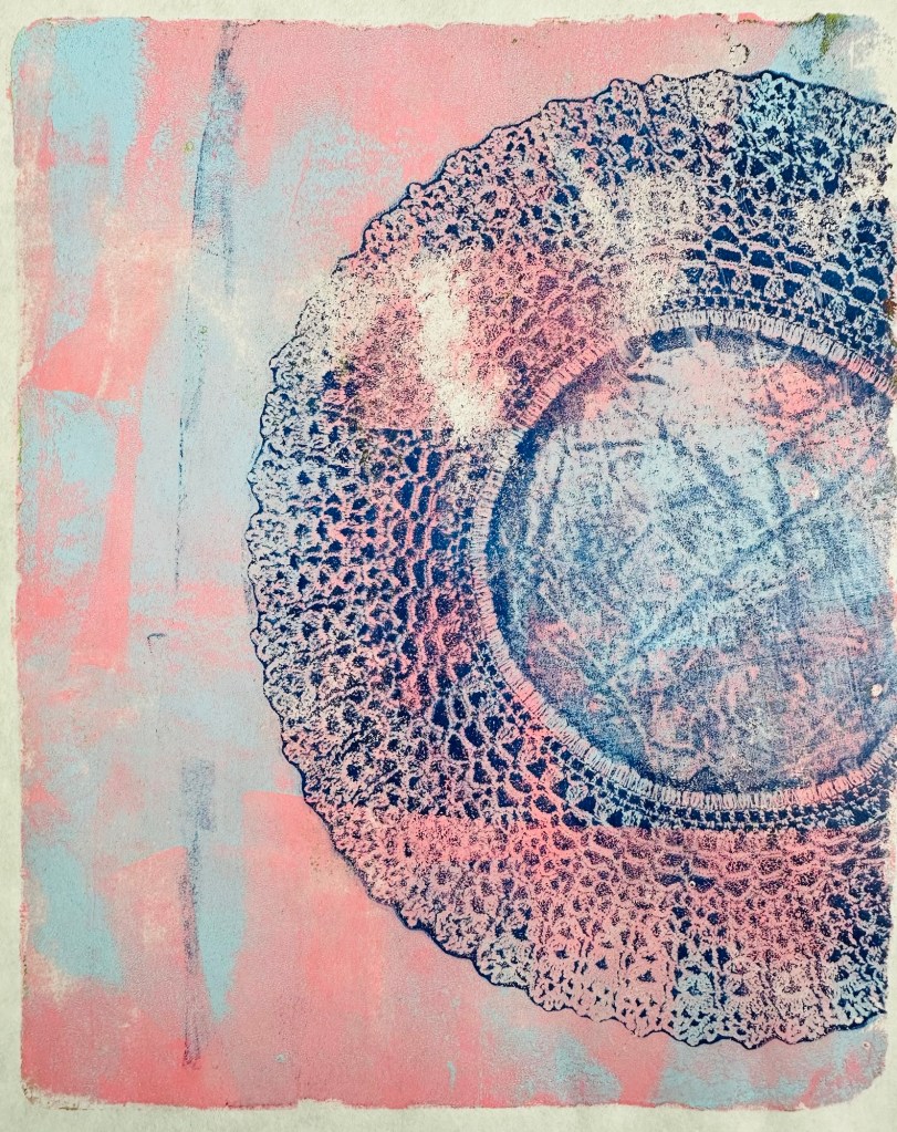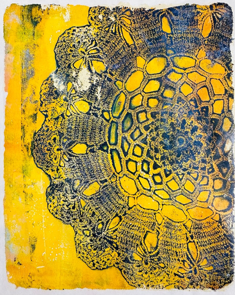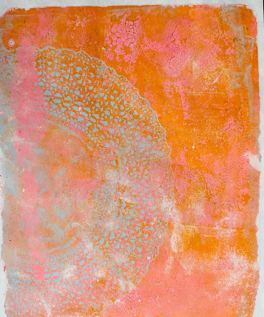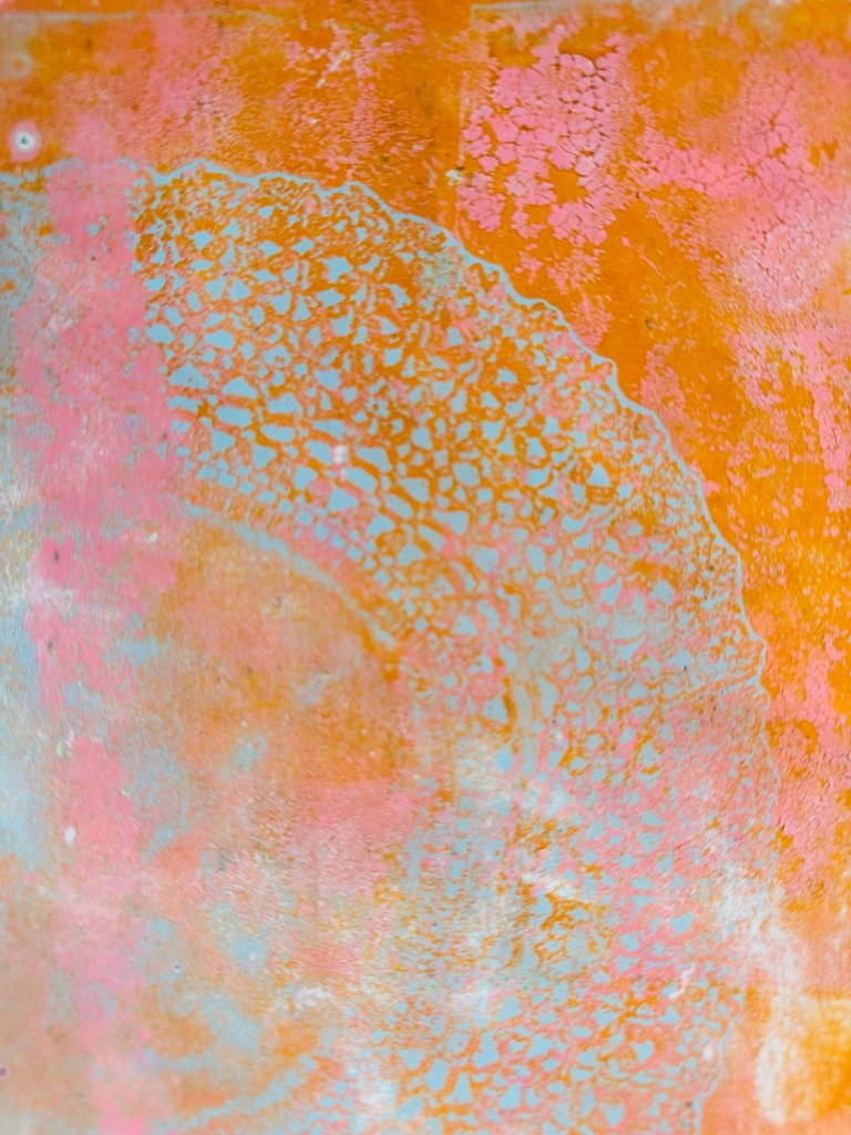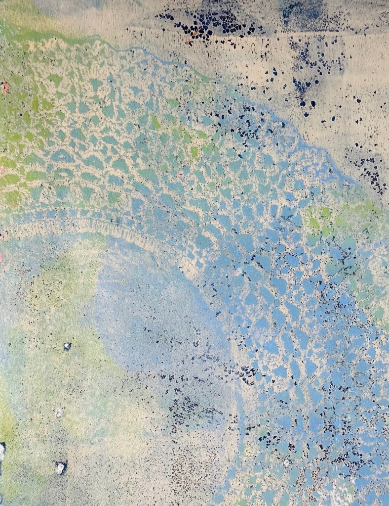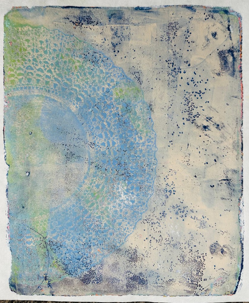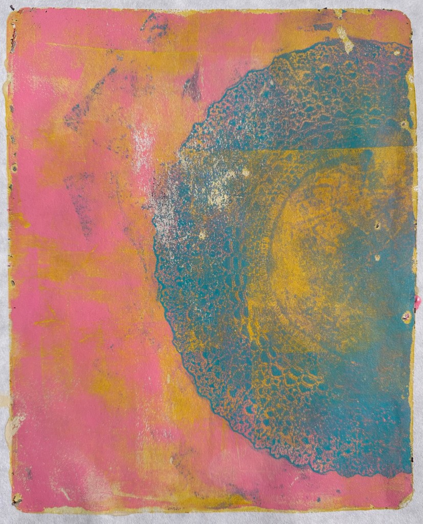 The pages I removed were mainly gelli plate prompts. It looks like I was using masks to print directly onto the pages. What’s interesting is, despite being perhaps 6 years old, there’s many of the same shapes and marks I use now.