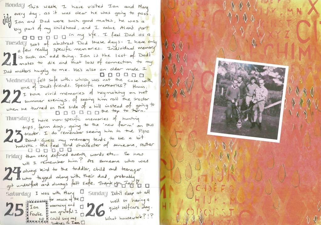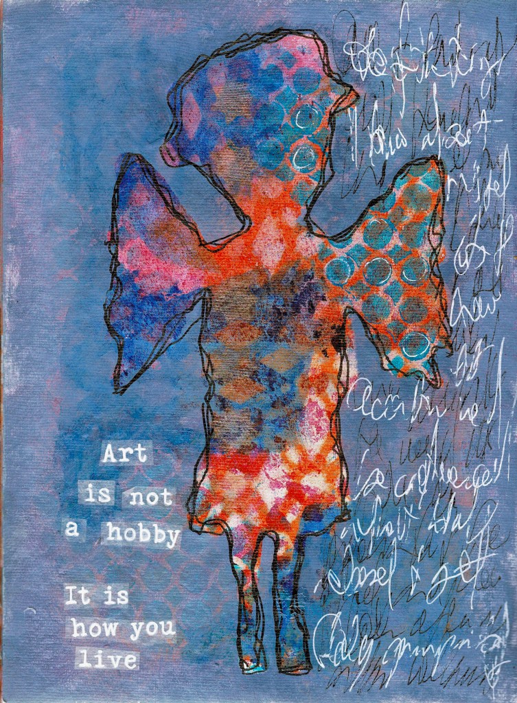Some weekends, aside from cooking meals & basic things like washing etc, I spend both days at my art desk. This is one of those weekends. Tony is in more pain and sleepy so he’s sitting in the lazyboy, napping, while I play with my art supplies. Art is good for me – the movement of my hands, the meditative sense of slowed-down time when fussy cutting out images, and the chance to get my thoughts & feelings out of my head and into my art journals.