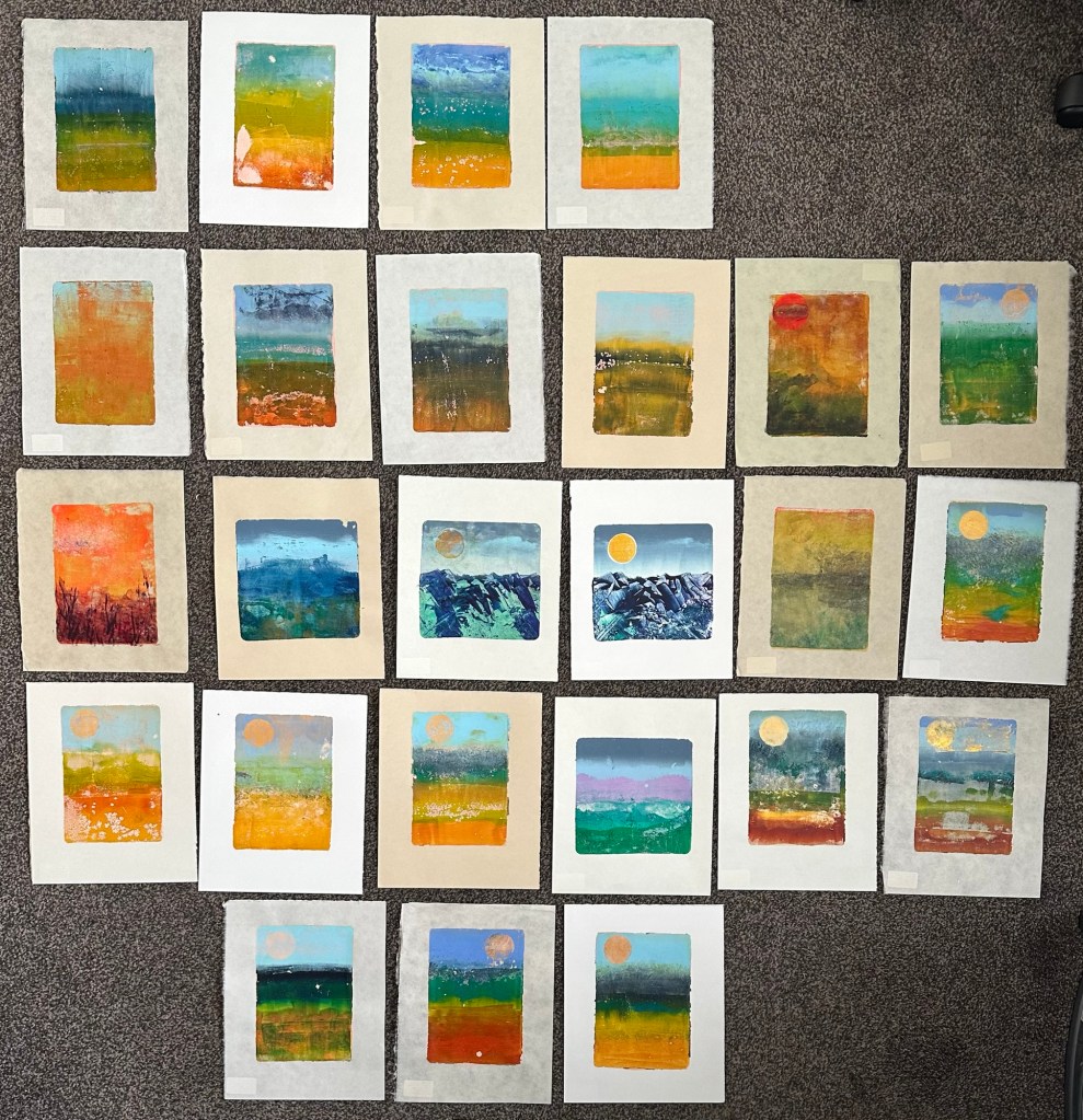 I have entered the Awagami International Miniature Print Exhibition in Japan. Prints have to be on A4 washi paper. I made a few prints on copier paper to get used to the size, then swapped to washi. I loved the first prints but keep going for another two or three weeks because “it needs to be my best print”.