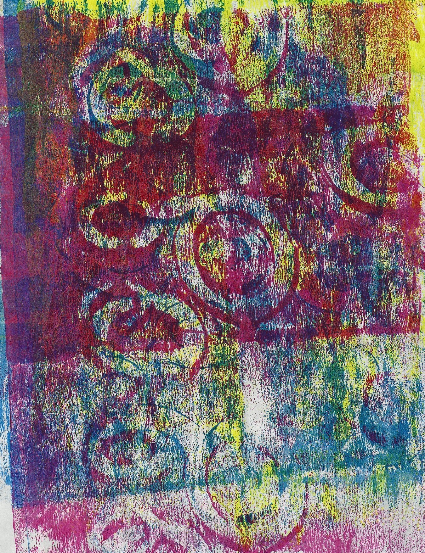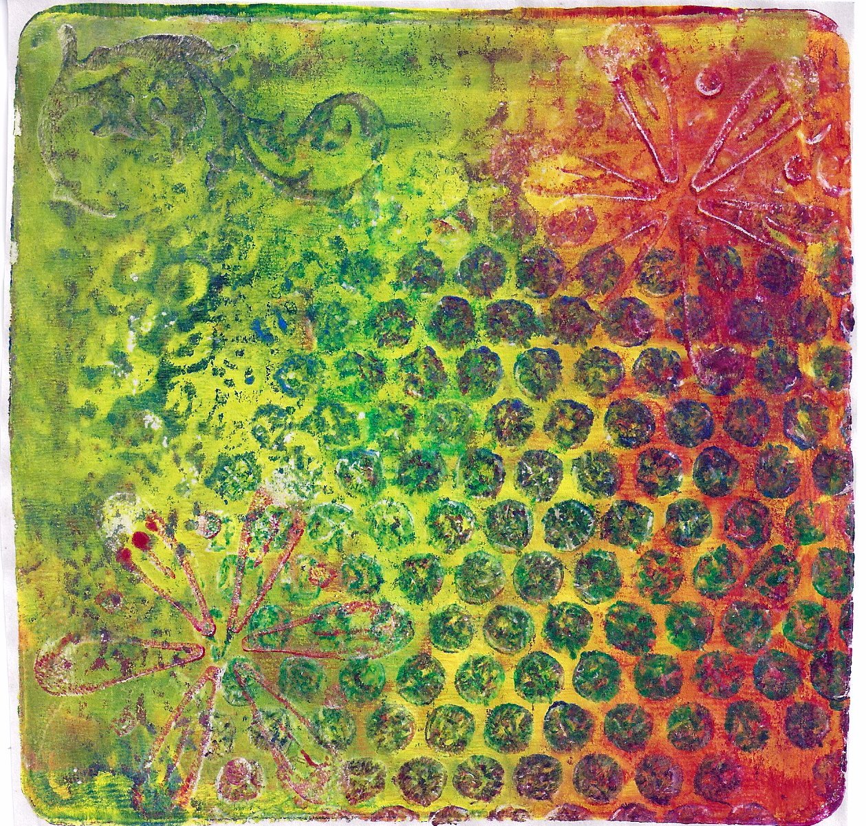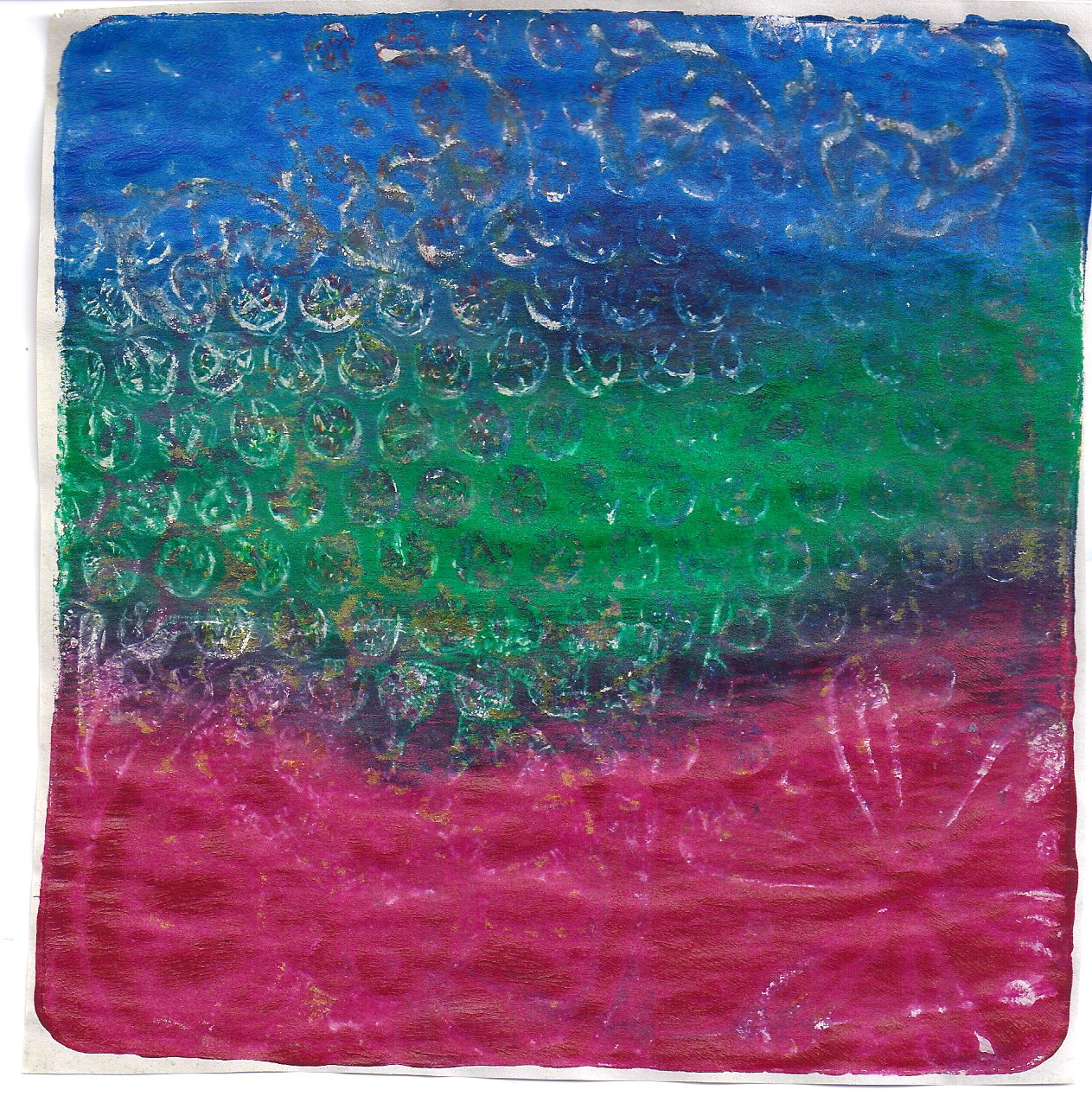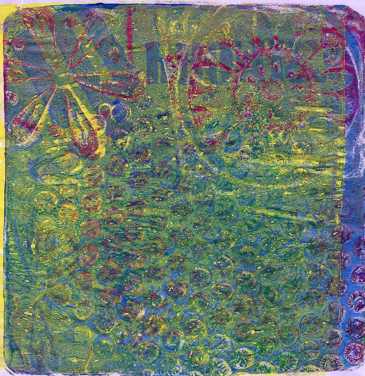 Yesterday I got out my Gelli Plate, a new selection of colors, foam stamps, bubble wrap and a pile of plain newsprint and some newspaper. I like the way fluid acrylics print on the absorbent newsprint, but had to be patient as it needs to be fully dry before trying to overprint. I’m not sure what I am going to do with these yet, but I know I’m not finished with them…. As with previous prints, the paper I cleaned my brayer on was worth saving.
