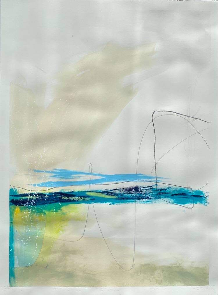 This is one of the pieces I did before I got to the final shape of the island at Waverley Beach.This is an example of where I’ve started with water soluble pencil and a wandering line.Playing with mark making. The strong vertical line on the right is the start of the more mast-like lines.This is the very recent piece that has me thinking sea and mast … maybe! If it is, I don’t know where the mast comes from in my memory, but I guarantee it will be a memory.