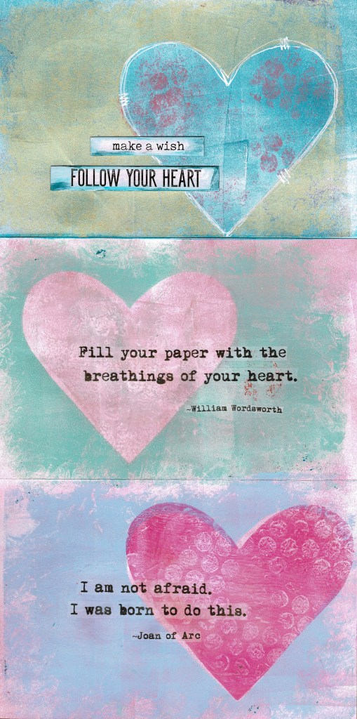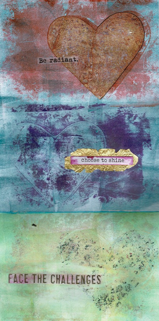 Today’s #creativejumpstart21 artist was Marsha Valk, and we made an accordion fold book using gelli printing. Mine isn’t quite to script, but I had a lot of fun doing it. I used Dina Wakley and Reeves paints, Dina Wakley collage paper, and a lovely Golden gold paint.